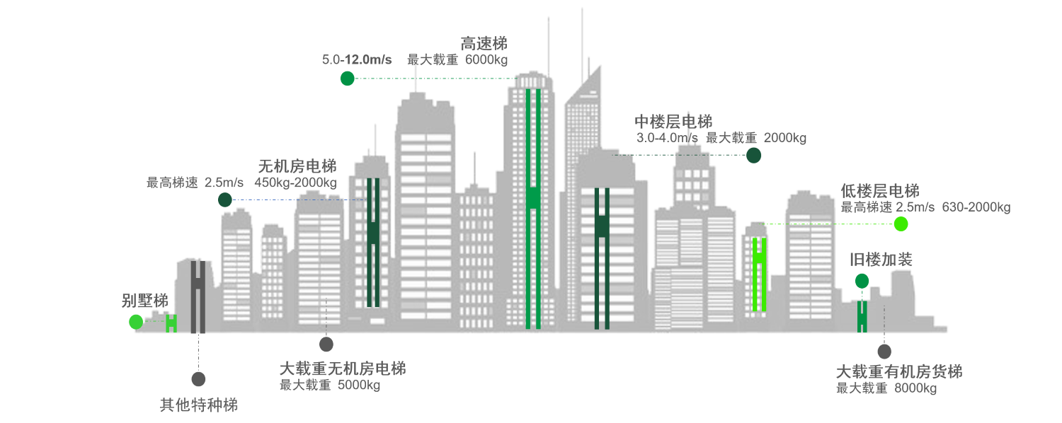 Vonógépek és hozzáillő nagyszámítógépek széles választékát kínáljuk, amelyek alkalmasak 6000 kg maximális teherbírású (2:1 arány) és 12 m/s (1:1 arányú) maximális sebességű alkalmazásokhoz. Az ügyfelek közvetlenül választhatják ki a megfelelő modelleket a felvonóparaméterek alapján, jelentősen lerövidítve a tervezési ciklust.