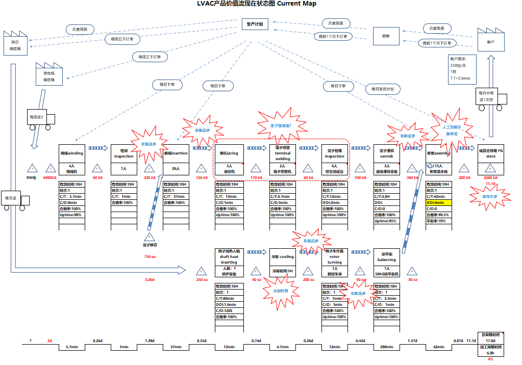 A Value Stream Maps és a kulcsfontosságú elemzett gépmodellek aktuális állapottérképei, valamint a karcsú értékfolyam hat alapelvének (áramlás létrehozása, átfutási idő lerövidítése, hulladékcsökkentés, készletcsökkentés, személyzeti kihasználtság javítása és helykihasználás javítása) ötvözésével a csapat előzetes VSM elemzéssel azonosította a fejlesztési lehetőségeket.