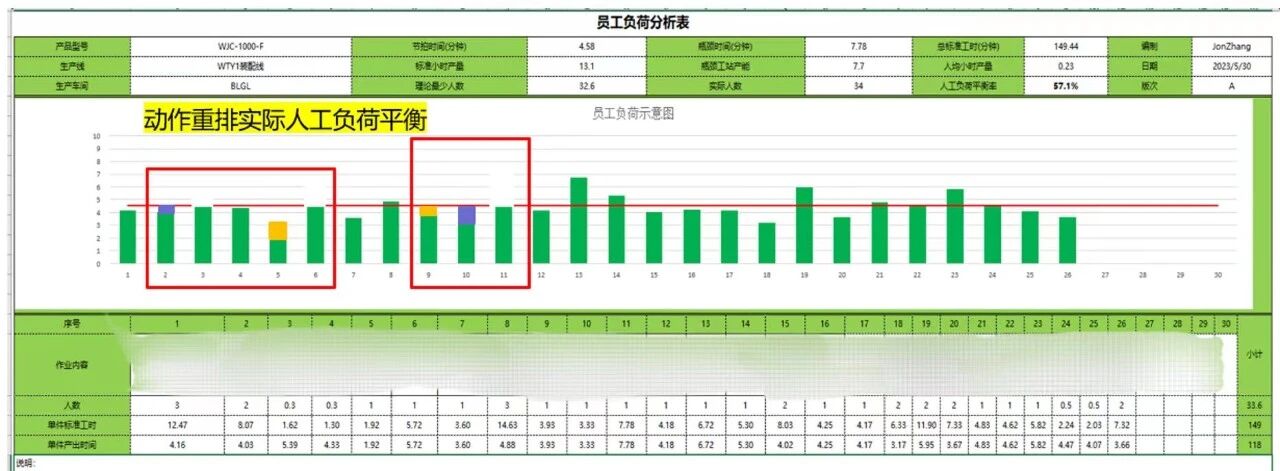 Az alkalmazottak terhelési aránya a kapacitásfejlesztés alapvető eleme. A folyamatok közötti inkonzisztens ciklusidők miatt a tényleges kibocsátás viszonylag alacsony volt. A korábbi sorkiegyenlítési fejlesztések során felhalmozott tapasztalatokat kihasználva az ME részleg vezető szerepet vállalt a gyártósoron dolgozók munkaterhelés-kiegyenlítési arányának növelésére irányuló kezdeményezésekben. Az ECRS-elv (Eliminate, Combine, Rearrange, Simplify) alkalmazásával a folyamatok optimalizálása érdekében a dolgozók munkateher-egyensúlyi aránya 82% fölé emelkedett.