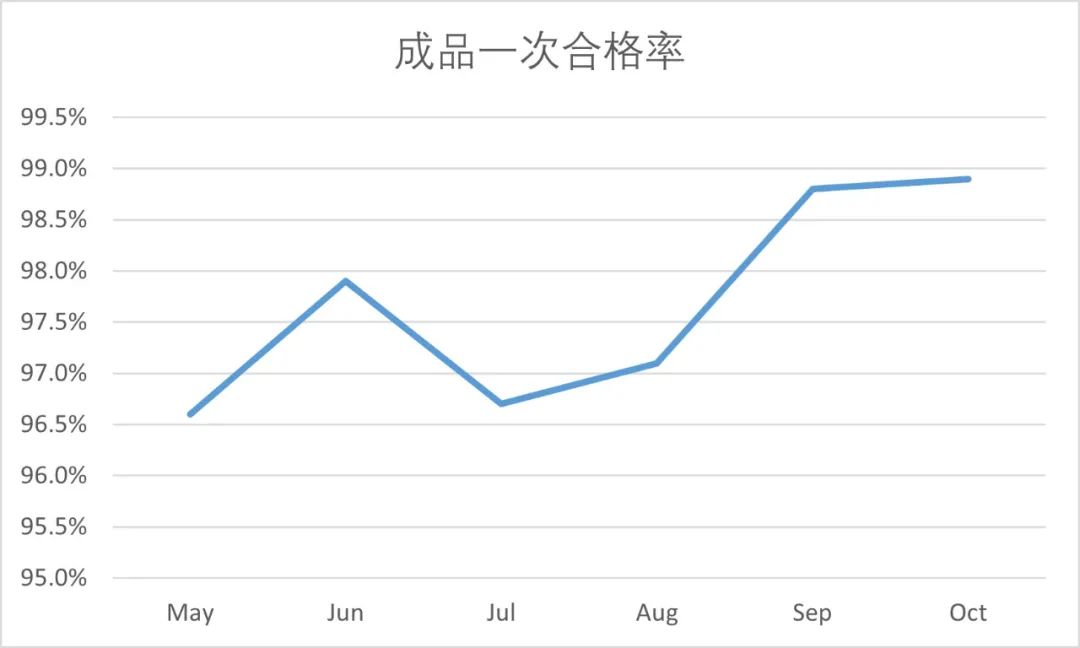 A minőségi hónap fejlesztési kezdeményezésének végrehajtása révén az összes alkalmazott minőségi tudatossága jelentősen javult, és a minőségi mutatók jelentősen javultak. Pontosabban, az 5M1E -ben az "ember" tényezőjével kapcsolatos hibák jelentősen csökkentek; A hiányzó telepítés, a helytelen telepítés és a vegyes telepítés aránya nevezetesen csökkent; A releváns folyamatok potenciális minőségi veszélyei jelentősen csökkentek; és a folyamatok működési minőségét folyamatosan optimalizálták. Ennek eredményeként az első átjárható hozam és a késztermék első helyezett képesítési rátája 1-2%-kal nőtt, míg az ügyfelek panaszai és a termékek megtérülése jelentősen csökkent. Az adatok nyilvánvaló javulásai teljes mértékben megmutatják a fejlesztési kezdeményezés hatékonyságát és értékét.