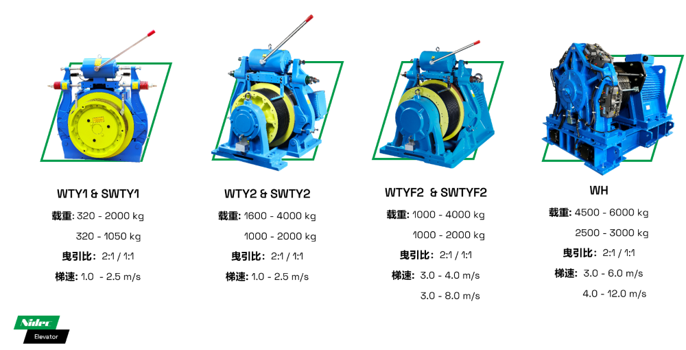 • Tömb típusú fékeket és kettős tartószerkezetet alkalmaz, 15 tonnás axiális teherbírással, ami stabilabb és megbízhatóbb általános gépteljesítményt biztosít; képes megfelelni a különböző ipari parkok szállítási igényeinek és teljes mértékben kielégíti az ipari liftek igényeit.