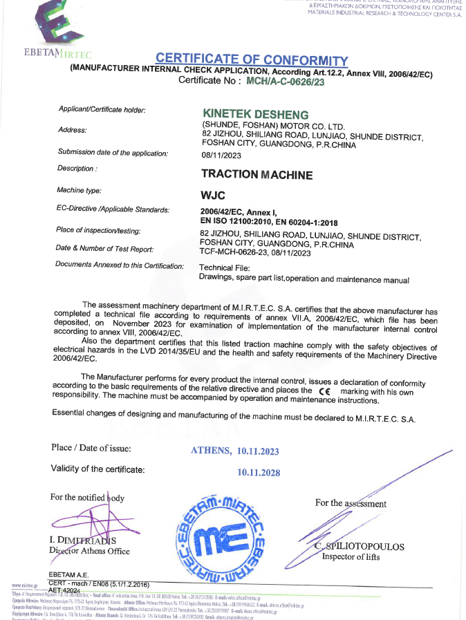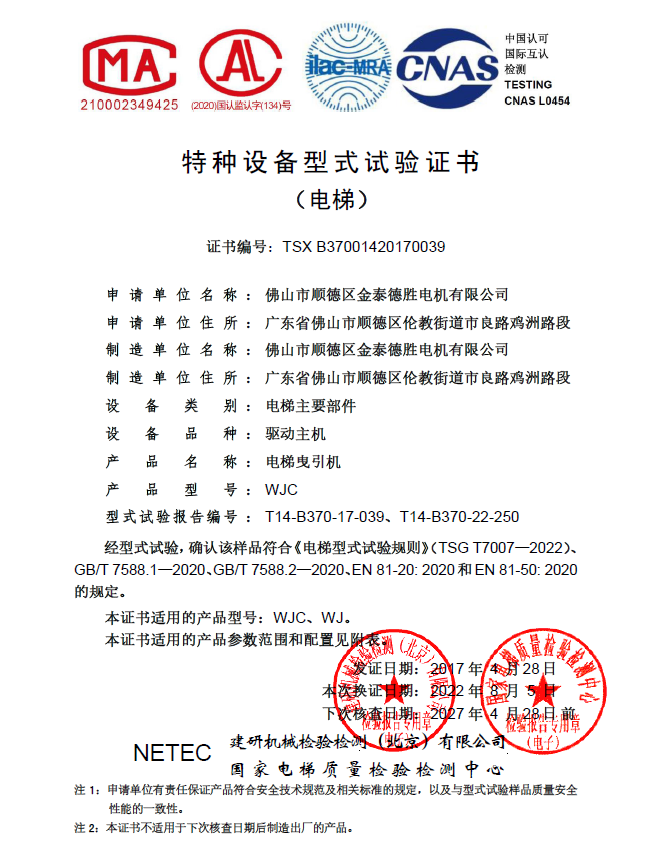 4. EU CE tanúsítás (CE tanúsítás a motorok mechanikai irányelvéhez és az EN81 -tanúsításhoz): Modelleink összes sorozatának, például a WJC/WTY1/WR/WTY2 sorozatának lefedése.